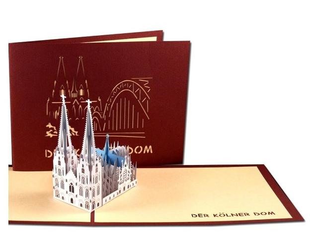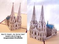 Das Wahrzeichen Kölns, der Kölner Dom, zählt mit seinem 157m hohen Turmpaar zu den weltweit größten Meisterwerken gotischer Architektur. Dies hat uns veranlasst, die im gotischen Stil gestaltetete Fassade des Kölner Doms mit Begeisterung und Bewunderung für dieses einzigartige Bauwerk in Miniaturformat als 3D Klappkarte aus hochwertigem Papier nachzuempfinden. Das 3D-Objekt „ Der Kölner Dom“ besteht aus 26 filigran ausgestanzten Einzelteilen, die in Handarbeit zusammengefügt werden. Dies ist eine Grußkarte der ganz besonderen Art….